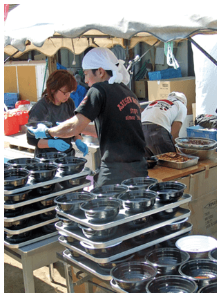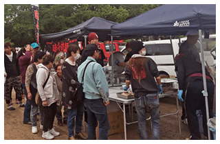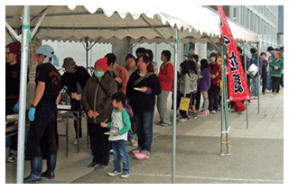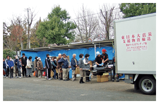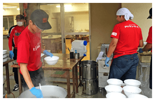 発生から約1ヶ月、東北道高速道路が開通したことで熊本からの輸送が可能になり、1日半をかけトラックで宮城県仙台市入り。3班体制で1週間ずつスタッフが入れ替わり、3週間炊出しを仙台市や石巻市など13カ所6,050杯を実施。