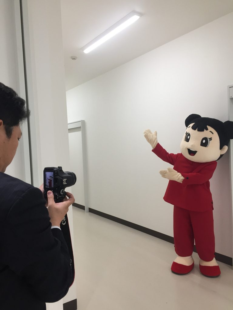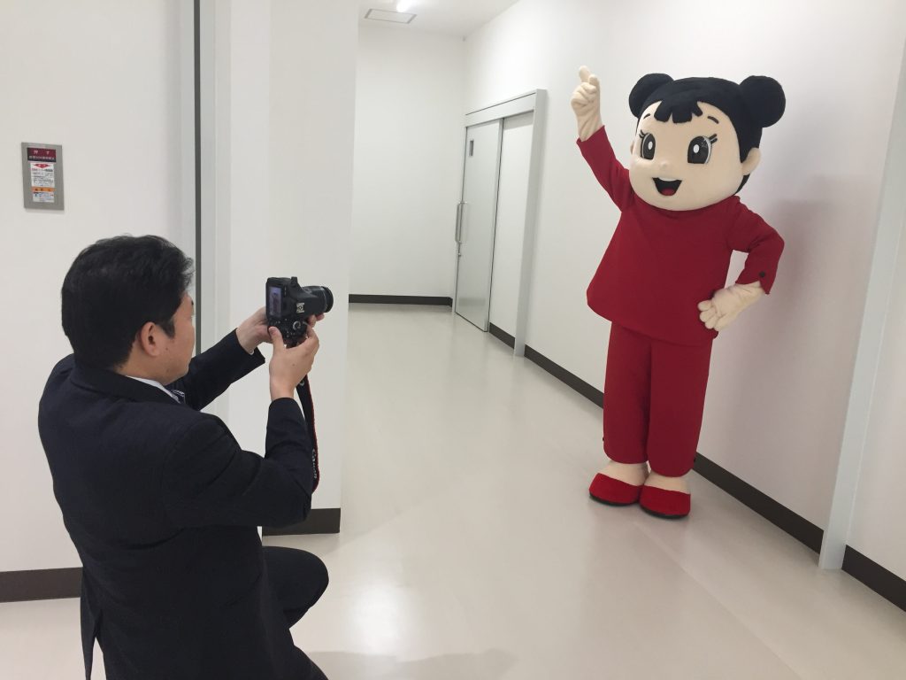 弊社のキャラクター おなじみ「チイちゃん」の宣伝材料となる写真撮影が社内で