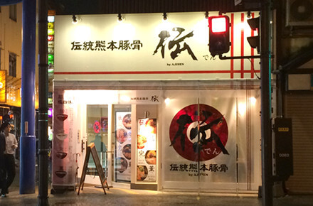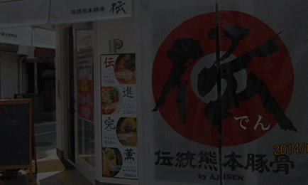 味千拉麺のNEWブランドとして2014年にオープンした伝統熊本豚骨 伝。 お店の名前は伝統伝承伝説の3つの伝から取ってあり、昔の味を 復活現在の味を守りながら新しい味へ進化するという意味があります。