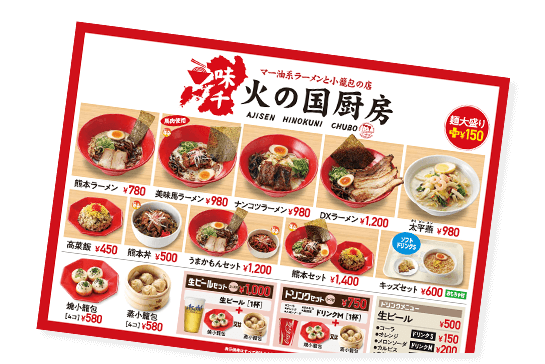 味千拉麺人気メニュー ナンコツラーメン(パイクー麺)やDXラーメン(贅沢炙りチャーシュー麺)、 上海焼き小籠包千包の焼き小籠包など両ブランドの人気商品を取りそろえ 熊本名物太平燕、馬肉や高菜を使ったラーメン・丼物など火の国熊本の 郷土料理の厨房をイメージした今までにないブランドのハイブリッド店舗となっています。