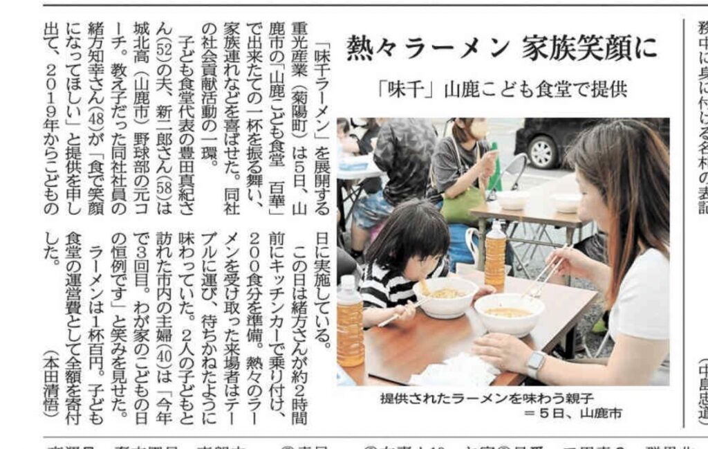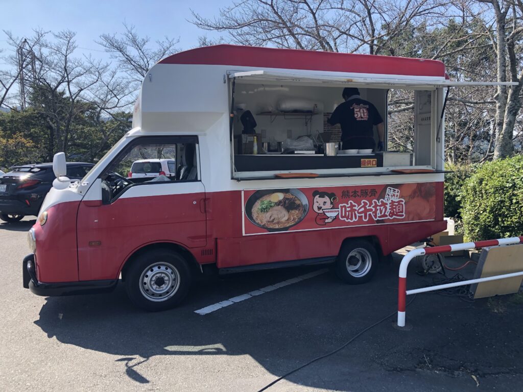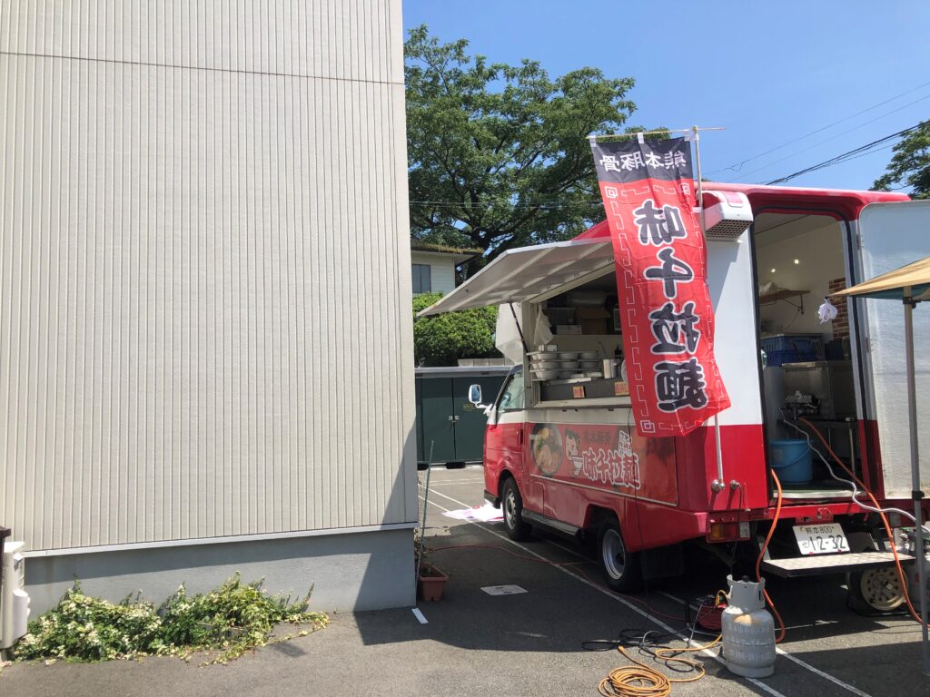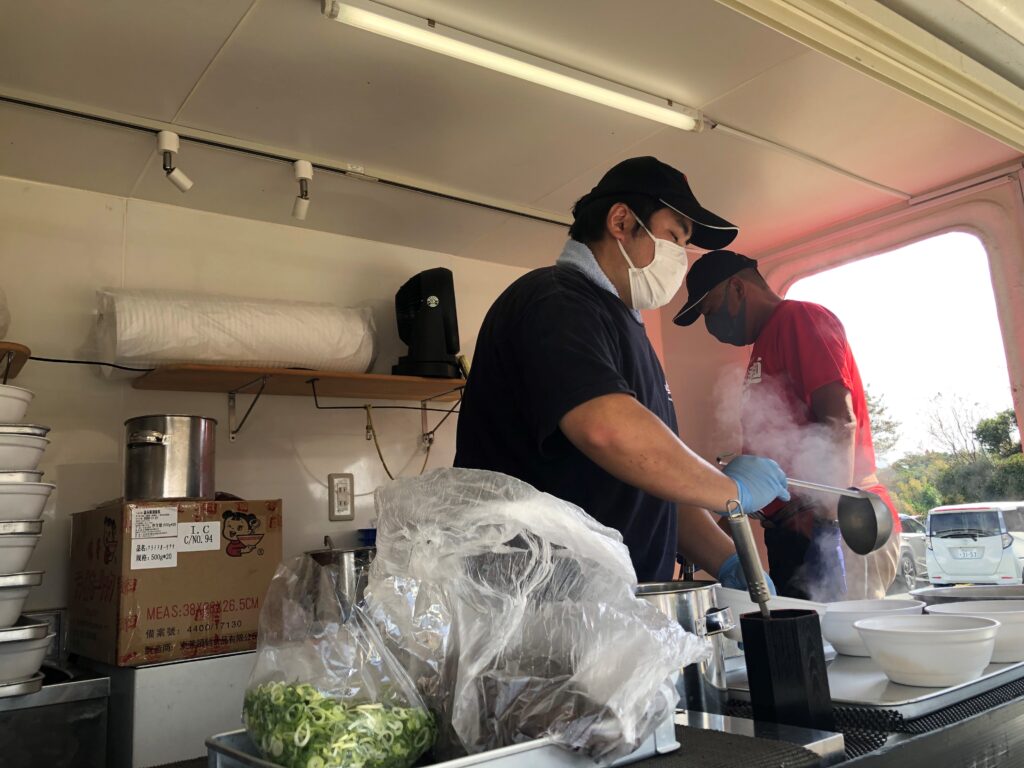 味千拉麺キッチンカーで訪問、1杯100円で販売(お持ち帰りは別途)し、