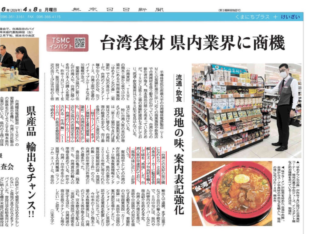 202404.08 本日の【熊本日日新聞】に限定商品【台湾牛肉麺】の紹介が掲載されました。 本日4月8日の【熊本日日新聞】朝刊 に限定商品【台湾牛肉麺】の紹介が掲載されました。 味千ラーメン店舗で販売しています、ぜひご来店ください。