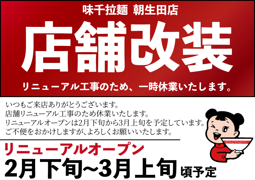 味千拉麺 朝生田店 一時休業のお知らせ