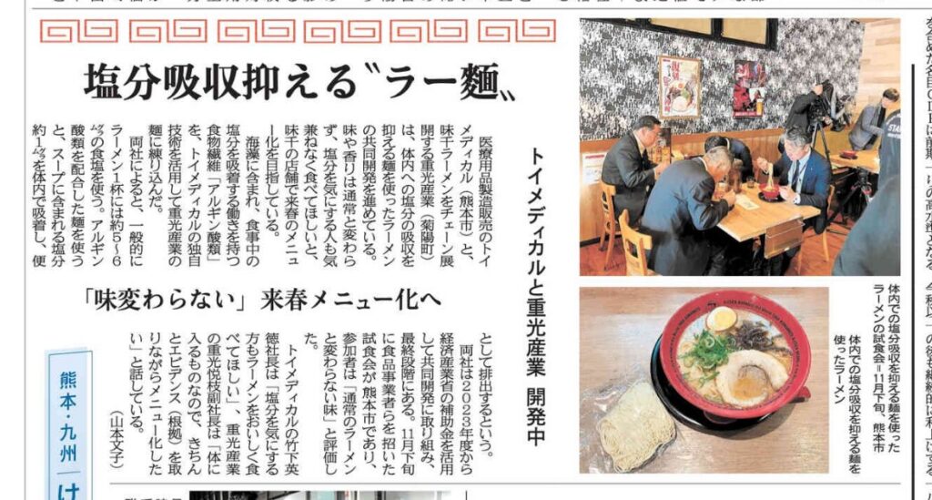 熊本日日新聞にトイメディカル様との共同開発【塩分オフセット麺】の記事が掲載されました。