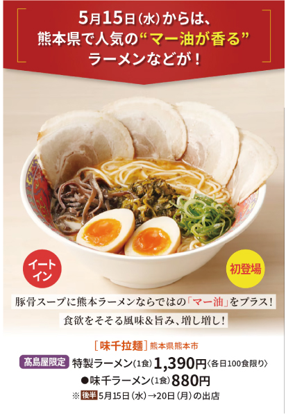 「味千拉麺 菊池店」において店舗メンテナンスのため、5月11日(日)を休業とさせていただきます。