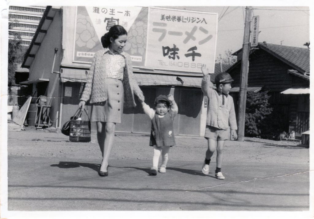 味千ラーメン本店創業当時の店舗が後ろに写り、ご家族で横断歩道を渡っていらっしゃる写真です。