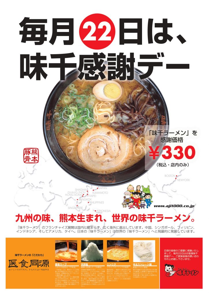 本日はお客様への感謝をあらわす、毎月22日の味千感謝デーとなります。