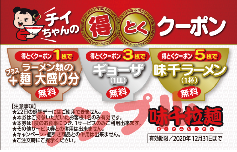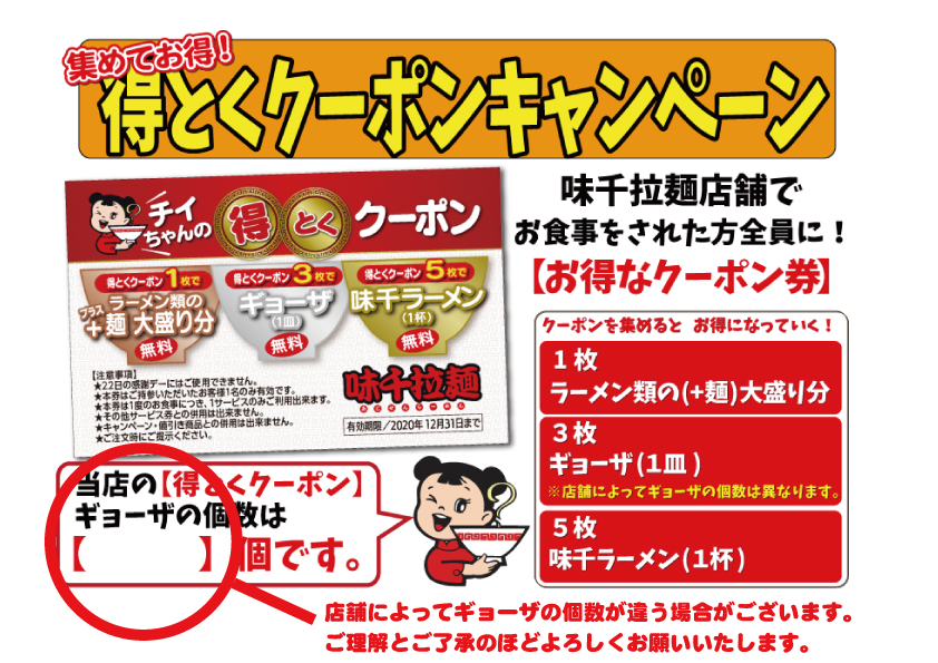 10月1日より味千拉麺店舗でお得な【得とくクーポン】がもらえます。